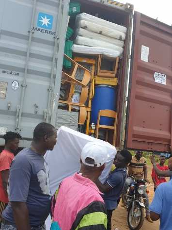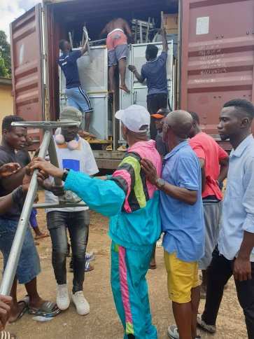Am 28. und 29. September 2024 wurden mit vielen Helferinnen und Helfern 2 x 40‘-Container beladen, da wir und unsere drei Hallennachbarn die Fliegerhorsthalle wegen Abriss verlassen mussten. Musa Bainda in Freetown hat sich um die Abwicklung gekümmert. Eines Tages rief er mich an und weinte förmlich am Telefon: „Gila, das Ministerium hat uns ohne Vorankündigung die Zollfreiheit verweigert, wir müssen 11.225,00 € Zoll zahlen. Es darf nur noch zweckgebundenes Material zollfrei eingeführt werden z.B. bei Ebola-, Cholera, Corona usw.“ Nach dem Telefonat bin ich wie ein Huhn ohne Kopf durch die Wohnung gekreist. Woher das Geld nehmen?Wir haben sofort den Schulbau gestoppt und uns einen Teil vom Schulbaukonto geliehen, um nicht unnötig Standgeld im Hafen zahlen zu müssen. Trotzdem wurden wir noch mit 640,00 € Standgeld belastet. Unter diesen neuen Bedingungen werden wir künftig kein Lager mehr anmieten, sondern höchstens noch Beiladungen mit äußerst wichtigem Material auf den Weg bringen.